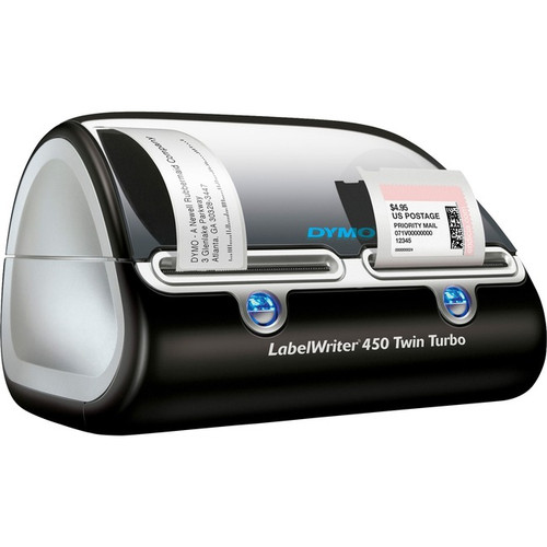 LabelWriter 450 Twin Turbo holds two label rolls at a time for flexible thermal printing. Produce up to 71 labels per minute with your choice of more than 60 label styles and sizes. Label printer generates crystal-clear text, graphics and bar codes with 600 x 300 dpi graphics mode. Print labels directly from Microsoft Word, WordPerfect, Outlook, QuickBooks, ACT! and others without retyping. Included Dymo Label Software Version 8 lets you create and print address, shipping, file, folder and bar-code labels, plus name badges and more with your PC or Mac. Verify U.S. addresses and complete zip codes with included Address Fixer software. Built-in address book easily prints labels from your Outlook Contacts or Mac Address Book. Simply search and filter your contacts to print exactly the labels you want. USB-connected label printer includes cords, cable, instructions and starter labels.
