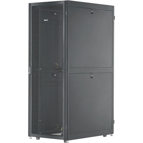 Net-Verse D-Type Cabinet frame, 48RU. Top panel with brush openings. Two sets cage nut equipment rails. Single hinge perforated front door. Split perforated rear doors. Horizontally split side panels (4). 2 full length PDU brackets. Dimensions: 91.1in H x 31.5in W x 47.2in D (2311mm x 800mm x 1200mm). Color: Black